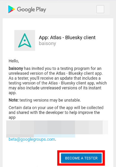 「Welcome to the testing program」と表示されたらベータテストプログラムへの参加は完了。続いて、青文字で「download it on Google Play」と記された部分をタップしてベータ版Atlasの配布ページにアクセスします。