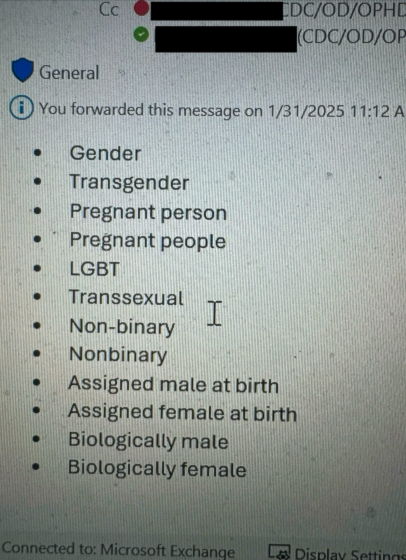 実際にInside Medicineが入手した、CDCの職員に送信されたメールの文面を撮影した写真が以下。禁止用語のリストには「Gender(ジェンダー)」「Transgender(トランスジェンダー)」「Pregnant person(妊娠中の人)」「pregnant people(妊娠中の人々)」「LGBT」「Transsexual(トランスセクシャル)」「Non-binary(ノンバイナリー)」「Nonbinary(ノンバイナリー)」「Assigned male at birth(出生時に男性に割り当てられた人)」「Assigned female at birth(出生時に女性に割り当てられた人)」「Biologically male(生物学的に男性)」「Biologically female(生物学的に女性)」など、LGBTQ+に関連する用語が含まれています。