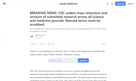 アメリカの独立系医学メディアであるInside Medicineの取材により、CDCが所属する研究者らに対し、外部の医学雑誌や学術雑誌への科学論文の出版を撤回、または一時停止するよう指示したことがわかりました。