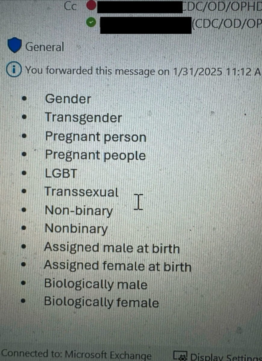 実際にInside Medicineが入手した、CDCの職員に送信されたメールの文面を撮影した写真が以下。禁止用語のリストには「Gender(ジェンダー)」「Transgender(トランスジェンダー)」「Pregnant person(妊娠中の人)」「pregnant people(妊娠中の人々)」「LGBT」「Transsexual(トランスセクシャル)」「Non-binary(ノンバイナリー)」「Nonbinary(ノンバイナリー)」「Assigned male at birth(出生時に男性に割り当てられた人)」「Assigned female at birth(出生時に女性に割り当てられた人)」「Biologically male(生物学的に男性)」「Biologically female(生物学的に女性)」など、LGBTQ+に関連する用語が含まれています。