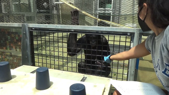 テーブルの前にはボノボのパートナー役のタウンロウ氏がいますが、黒いボードで仕切られているので、タウンロウ氏にはカップが見えません。