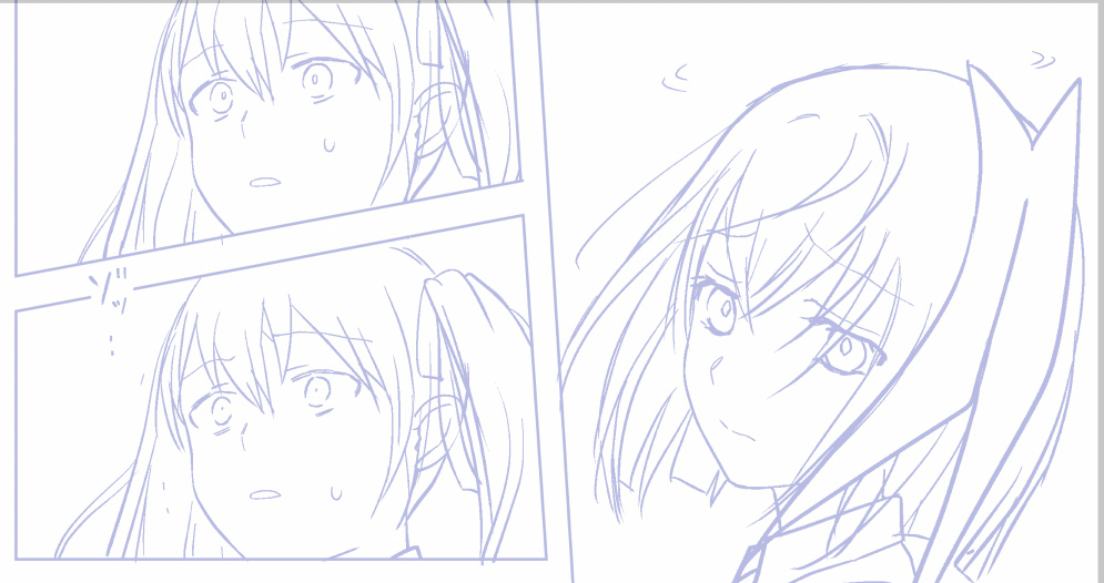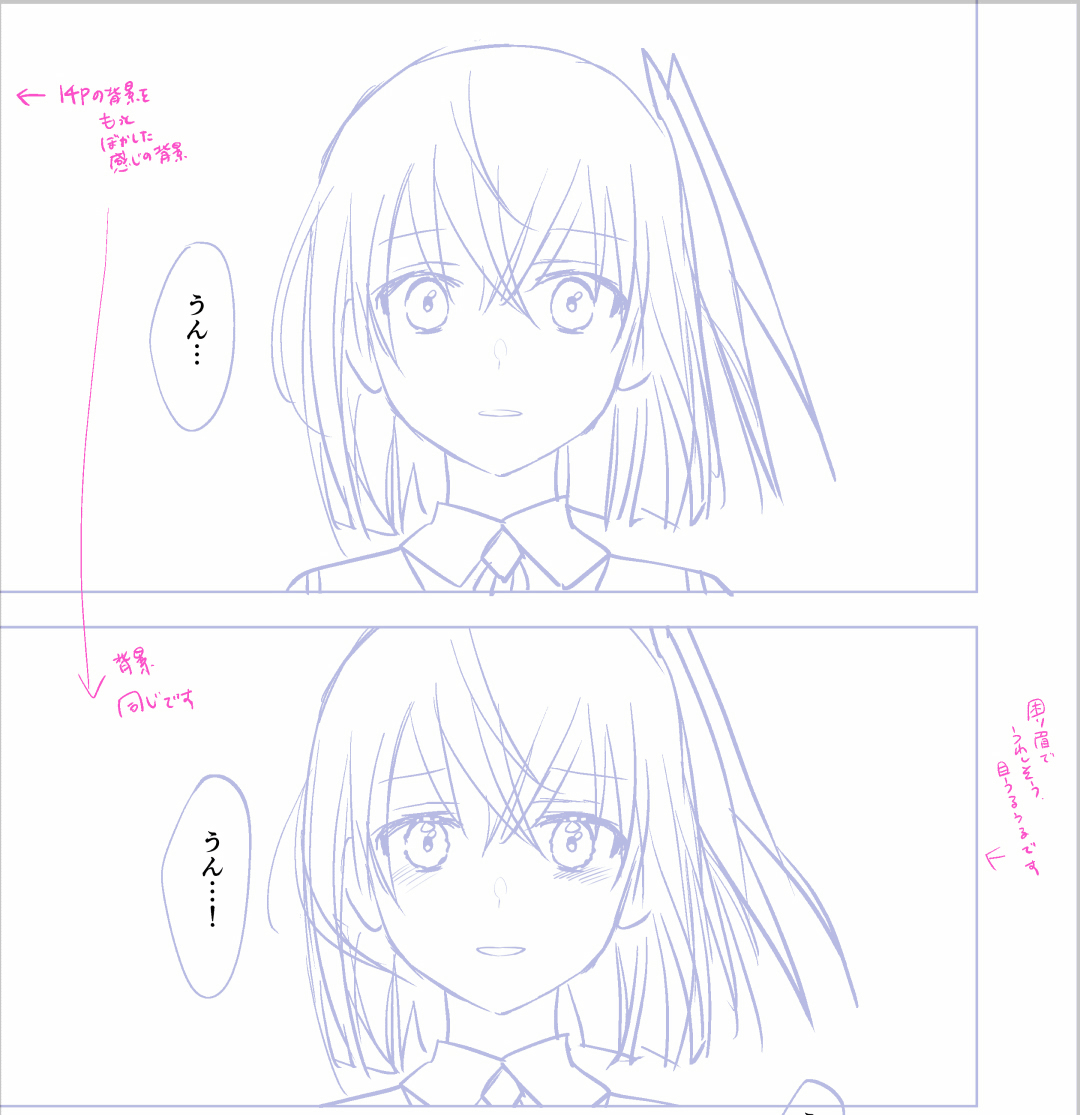 7話後編の冒頭シーン。凛音の表情がわずかに変化する2コマが印象的なシーンですが、ネームでも感情がありありと伝わってきます。以下のように表情でがっつり伝えるシーンでは、どのような意図の表情なのかメモ書きで作画担当に伝えるようにしています。
