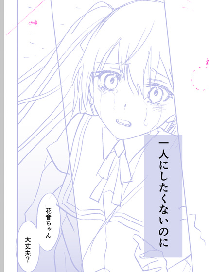以下は第8話冒頭シーン。凛音と別れる花音の悲しみが、ネーム時点でも色濃く表現されています。