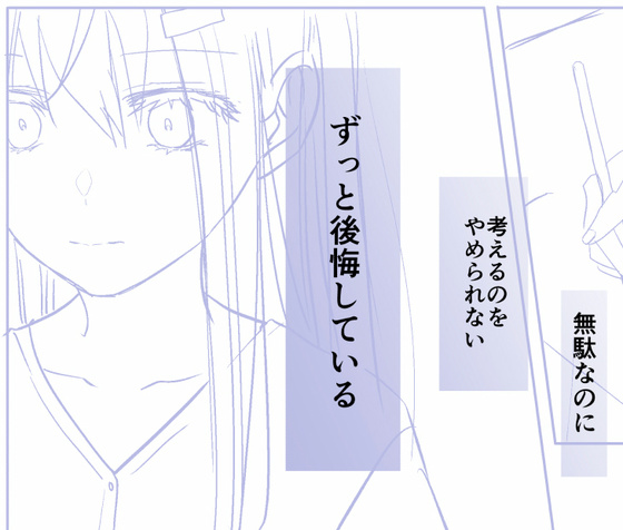 時がたっても公開を抱き続けている花音の表情。以下のような表情では、ネームだけで作画に「こんなイメージの感情」と伝えることが難しいため、ニュアンスがうまく伝わるよう打ち合わせしています。