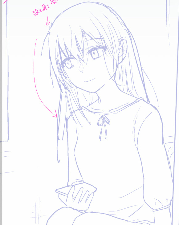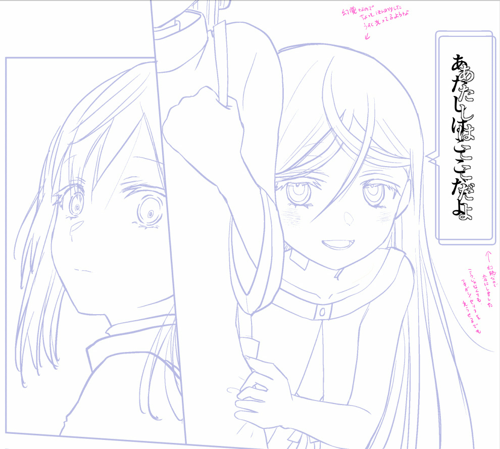 時がたっても公開を抱き続けている花音の表情。以下のような表情では、ネームだけで作画に「こんなイメージの感情」と伝えることが難しいため、ニュアンスがうまく伝わるよう打ち合わせしています。