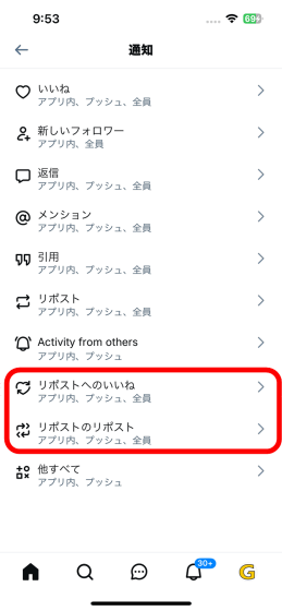 新たに「リポストへのいいね」や「リポストのリポスト」の通知も管理できるようになっています。