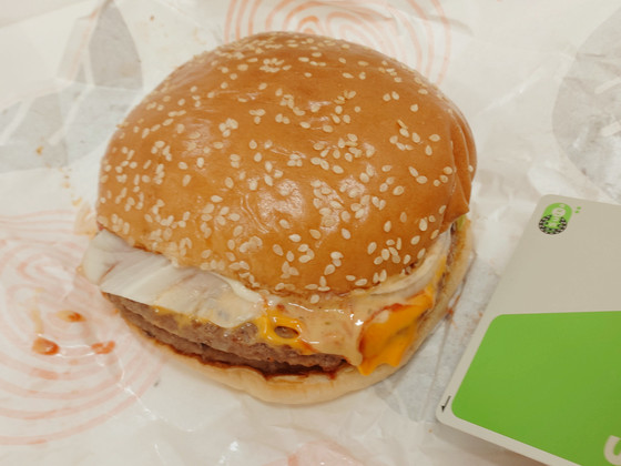断面図。「特製カウボーイバターソース」はバターが前面に出てくる味付けではなく、ビーフパティに塩分や脂分を加える役割を果たしています。バターが主張するのではなく、あくまで「肉の味を引き立てる調味料」として存在している感じで、メインの味は2枚挟まった直火焼きビーフパティでした。チーズの味わいは控えめで、後ろに隠れている感じです。また、ピクルスや野菜たっぷりで、食べごたえは十分です。