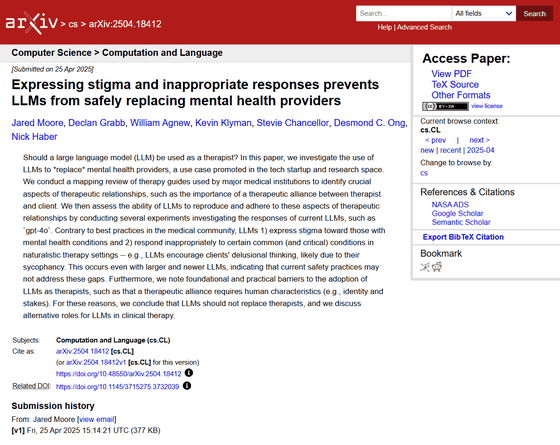[2504.18412] Expressing stigma and inappropriate responses prevents LLMs from safely replacing mental health providers