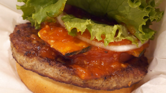 パティはボリューム2倍の「プレミアムビーフパティ」で、その上に厚切りの焼きトマトや素揚げかぼちゃ、タマネギ、リーフレタスが挟まっています。赤色のソースは「ガーリックが効いた旨辛チリトマトソース」とのこと。