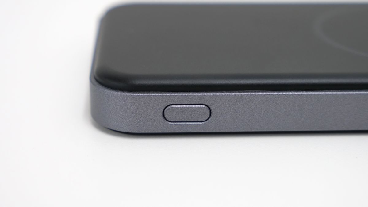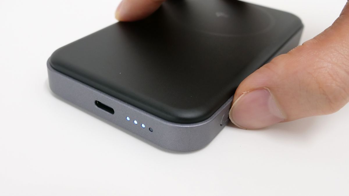側面の電源ボタンを短く押すと、LEDランプが点灯します。点灯するLEDランプの数はバッテリー残量を表しており、4個なら75%以上、3個なら75%未満、2個なら50%以下、1個なら25%以下とのこと。