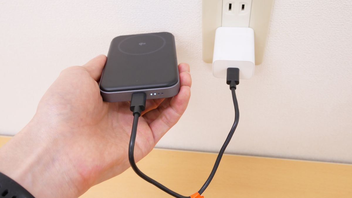 モバイルバッテリー本体を充電したい場合は、本体にUSB Type-Cケーブルを接続し、もう一方をコンセントに挿したACアダプターに接続すればOK。付属のUSB Type-Cケーブルは長さが20cmしかないため、机や床などから高い位置にあるコンセントで充電する時は、台の上にのせるなどの工夫が必要です。