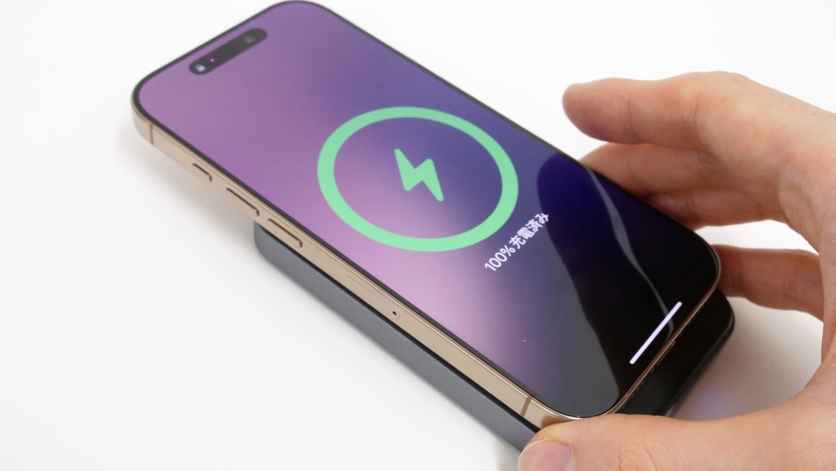 iPhone 12以降のQi2対応機種を本体のワイヤレス充電パッドに近づけると、マグネットでピタッとくっついてワイヤレス充電が始まります。Qi2ワイヤレス充電時の出力は最大15W。
