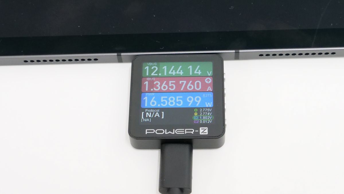 試しに、USB Type-Cケーブルで第5世代iPad Airを充電する際の出力をUSBテスター「Power-Z KM003C」で計測してみると、16W~17W前後の電力を出力していました。