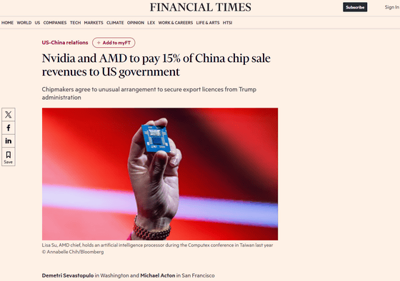 https://www.cnbc.com/2025/08/10/nvidia-amd-15percent-of-china-chip-sales-revenues-to-us-ft-reports.html