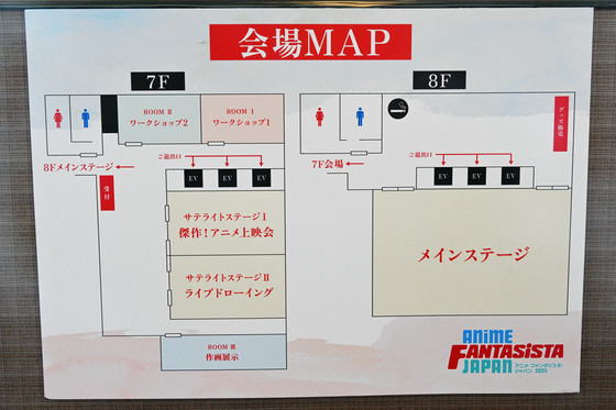 会場マップはこんな感じ。7階に受付とワークショップ教室、サテライトステージ、展示スペースが設けられ、8階のホールがメインステージとなっています。来場した人はまず7階で受付を行ってください。入場は無料ですが、メインステージのイベントは午前中のライブドローイング以外、観覧料が必要です。