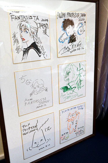 また、「ANIME FANTASISTA JAPAN 2024」に来場したゲストの黄瀬和哉さん、亀田祥倫さん、ちなさん、山本健さん、岩井澤健治さん、チームあんずちゃん(久野瑶子さん・飯塚智香さん・平井あかねさん)の色紙も展示されていて、撮影可能でした。