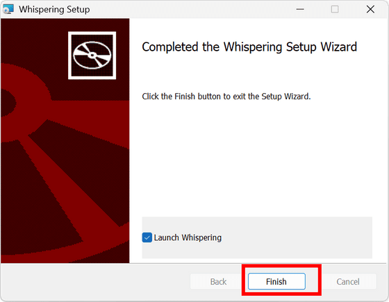 インストールが終わったら「Finish」をクリックしてWhisperingを立ち上げます。