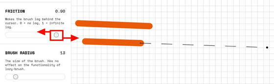 また、「FRICTION(摩擦)」の数値を大きくすると、マウスの動きに追随するブラシの速度がゆっくりになります。ブラシがゆっくりになればなるほど、なめらかな線を引きやすくなります。