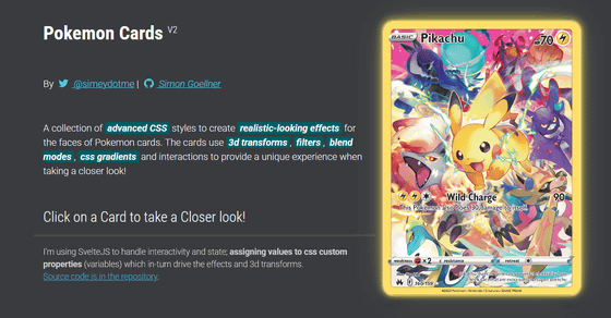 カードゲームのレアカードには、見る角度を変えると光り方が変わったり独特の質感があったりするものがあるため、カードの「レア感」は、デジタル上ではその魅力を十分に伝えることが難しいもの。ウェブ開発者のサイモン・ゲルナー氏は、ポケモンカードの高レアリティカードの光り方や質感をCSSで再現した様子をサイトで公開し、詳細をGitHubで共有しています。