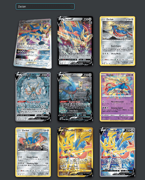 すると、ザシアンのカード全種類と全レアリティが表示されました。