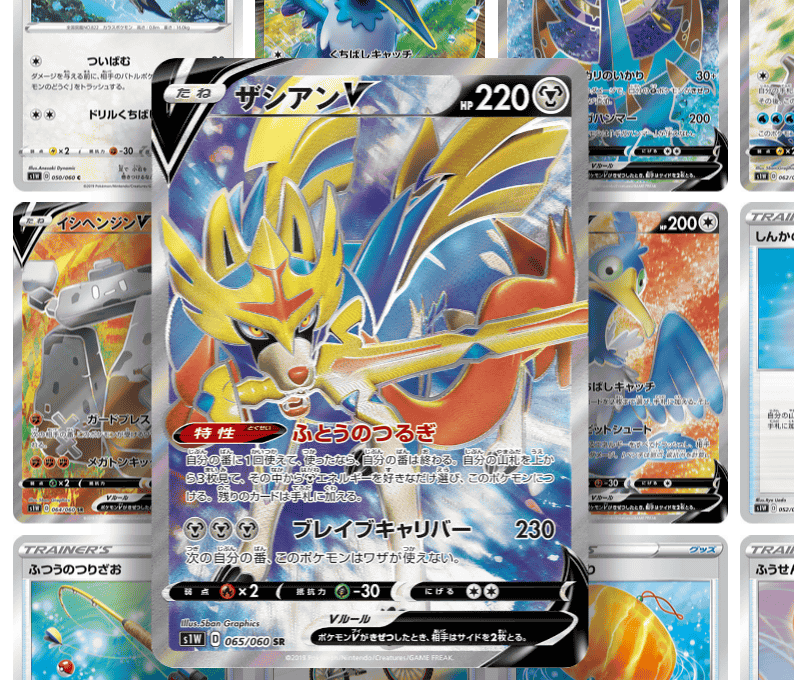 レアカードの魅力は画面上ではなかなか伝えることが難しいことがあります。例えば以下は、ポケモンカード公式サイトの「カード一覧」から、特にレアな「SR」のカードを拡大してみたところ。カード全体にイラストがあるかっこよさや、普通のカードと違う質感なことは分かりますが、レアカード特有の輝きは伝わってきません。