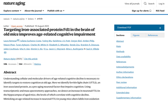 Targeting iron-associated protein Ftl1 in the brain of old mice improves age-related cognitive impairment | Nature Aging