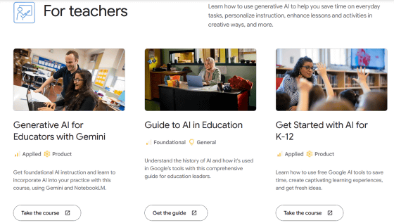 教師向けコンテンツの項目には、「Generative AI for Educators with Gemini(Geminiを使った教育者向け生成AI)」「Guide to AI in Education(教育におけるAIガイド)」「Get Started with AI for K-12(高校教育までの人々に向けたAI入門)」の3つが用意されています。