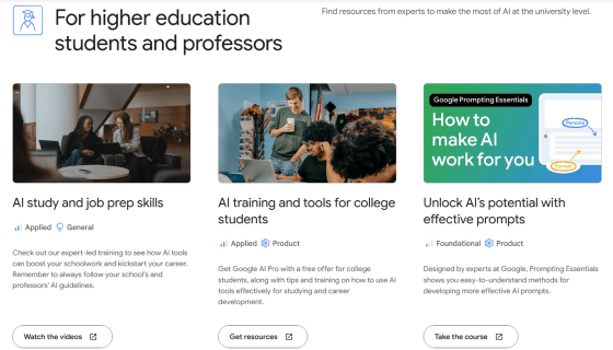 大学生や大学教員向けコンテンツは、「AI study and job prep skills(AIの勉強と就職準備スキル)」「AI training and tools for college students(大学生向けのAIトレーニングおよびツール)」「Unlock AI’s potential with effective prompts(効果的なプロンプトでAIの潜在能力を引き出す)」の3つ。このうち「AI study and job prep skills」と「AI training and tools for college students」は同じページにまとめられています。