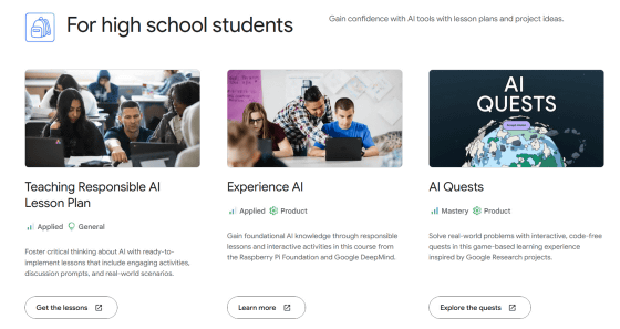 中高生向けコンテンツには生徒が自ら使うものに加えて、教師が教材として使えるものも含まれています。コンテンツは「Teaching Responsible AI Lesson Plan(責任あるAIを教える授業計画)」「Experience AI(AIを体験する)」「AI Quests(AIクエスト)」の3つ。