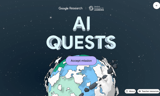 「AI Quests」は、Google ResearchとStanford Accelerator for Learningが開発した、ゲームベースのコードフリーAI学習プログラムです。生徒は研究者の立場になって、AIを活用してさまざまな問題を解決するプロセスを体験できるとのこと。