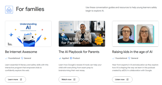 家族向けコンテンツには、親が子どもと一緒にAIについて学ぶためのコンテンツが用意されています。種類は「Be Internet Awesome(最高なインターネットユーザーになろう)」「The AI Playbook for Parents(親のためのAI活用ガイド)」「Raising kids in the age of AI(AI時代の子育て)」の3つ。
