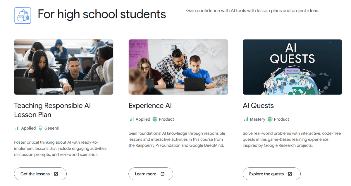 中高生向けコンテンツには生徒が自ら使うものに加えて、教師が教材として使えるものも含まれています。コンテンツは「Teaching Responsible AI Lesson Plan(責任あるAIを教える授業計画)」「Experience AI(AIを体験する)」「AI Quests(AIクエスト)」の3つ。