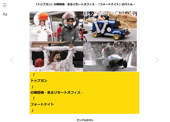 そんなKindleの試し読み機能で、GIGAZINE記事本の表示がおかしくなる事態が発生しました。以下は「レッドブル・ボックスカート・レース ロンドン」の取材記事を電子書籍化したものの冒頭ページ。カギ括弧が入るたびに改行され、表示が崩れています。