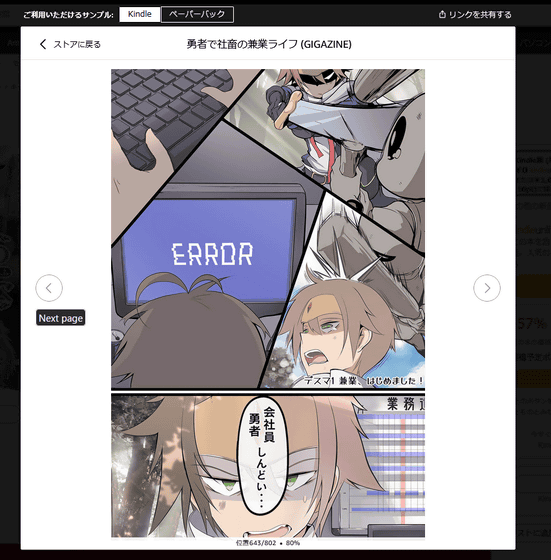 以下のように試し読みを開くことができます。Kindleダイレクトパブリッシングのヘルプによると、KDPで出版した本の試し読みは電子書籍が10%、ペーパーバックが20%で固定されています。マンガ「勇者で社畜の兼業ライフ」の場合、全部で約230ページあるため、試し読みでは「1話+2話の冒頭2ページ」という23ページを試し読みで読むことができます。