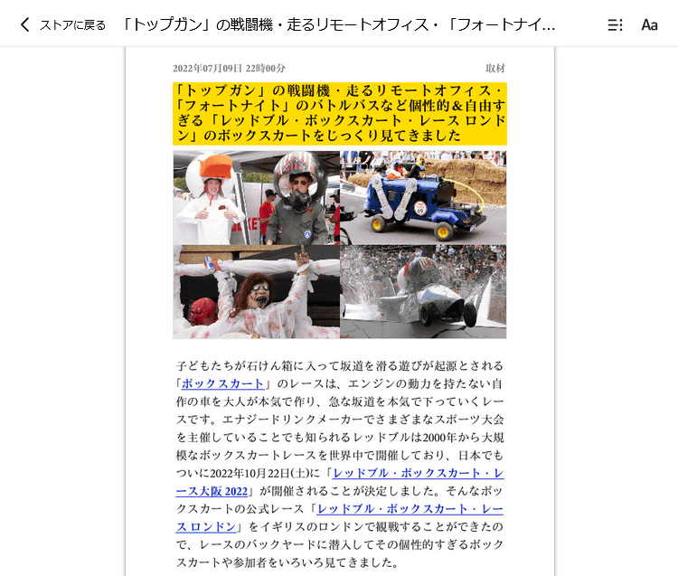 そんなKindleの試し読み機能で、GIGAZINE記事本の表示がおかしくなる事態が発生しました。以下は「レッドブル・ボックスカート・レース ロンドン」の取材記事を電子書籍化したものの冒頭ページ。カギ括弧が入るたびに改行され、表示が崩れています。