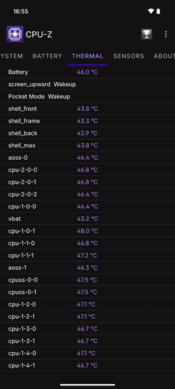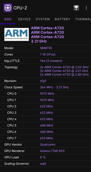 まずはCPU-Zでスペックの確認。搭載されているSoCはSnapdragon 8s Gen 4で、CPUは8コア。GPUはAderno(TM) 825を搭載しています。
