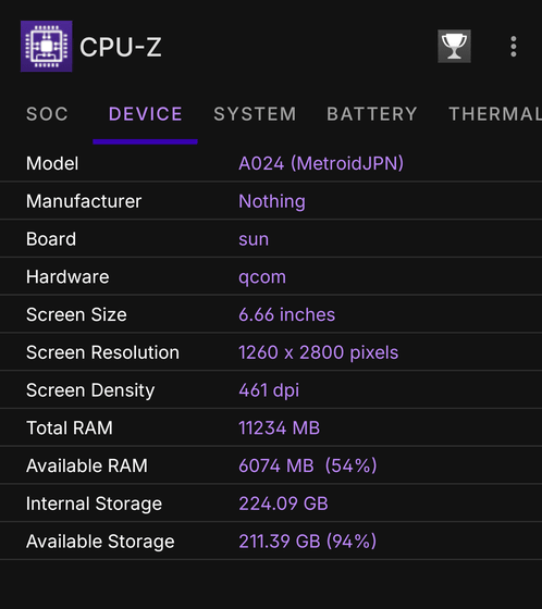 デバイスの型番は「A024」と表示されました。画面解像度は1260×2800ピクセル、画面密度は461dpi。今回借りたのはRAM12GB・ストレージ256GBのモデルで、RAMの総容量は「11234MB」、ストレージの総容量は「224.09GB」となっています。
