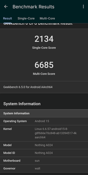 結果は以下の通り。パフォーマンススコアはシングルコアが2134、マルチコアが6685でした。