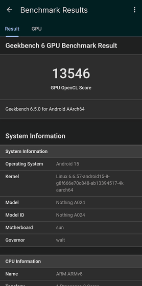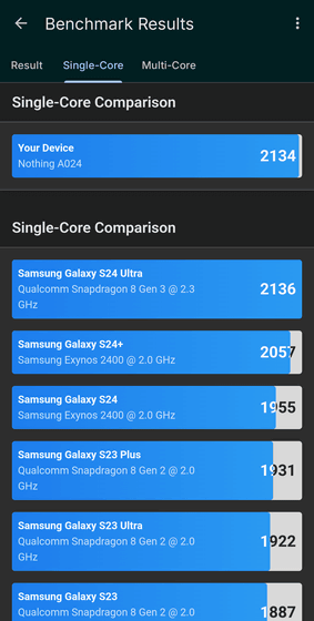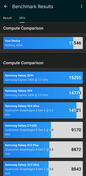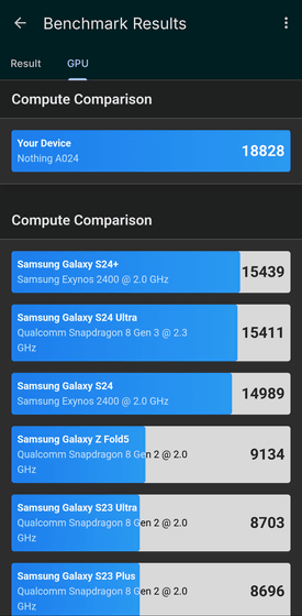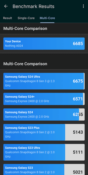 マルチコアのパフォーマンススコアも、Samsung Galaxy S24 Ultraと同程度。Nothing Phone (3)に搭載されているSoC自体はGalaxy S24 Ultraよりも1世代新しいはずなのですが、そのパフォーマンススコアはシングルコア・マルチコアのどちらもGalaxy S24 Ultraとほぼ同等という結果となりました。