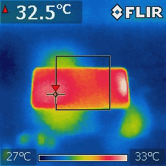 室温25度の部屋で、赤外線カメラのFLIRで画面を上にして机の上に置き、温度を測定してみたところ。テスト開始前だと表面温度はだいたい32度前後。
