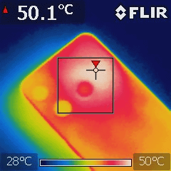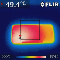 裏返して背面から温度を測定したところ。背面のカメラのやや右辺りで最高温度の50.1度を記録。内部ではおそらくこの辺りにSoCがあると予想されます。実際に手に取ってみると、持てないほどではありませんが、かなり熱くなっているのがはっきりわかります。