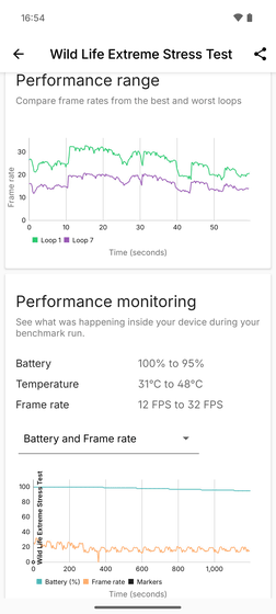 バッテリーとフレームレートを示す「Performance monitoring」はこんな感じ。バッテリーを100%まで充電した状態で20分のストレステストを行って、終了時のバッテリー残量は95%、表示フレームレートは12FPS~32FPSでした。