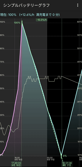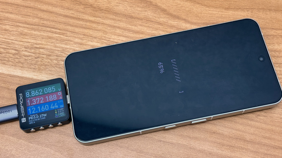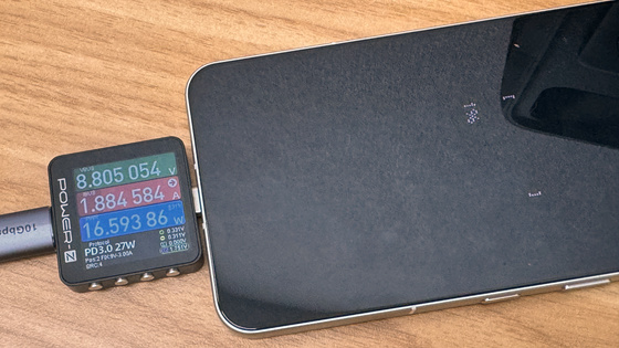 充電開始。Power-Z KM003Cには「USB PD 3.0」の27W(9V/3A)で急速充電が行われていると表示されています。充電開始直後の電力は実測値で約16Wでした。