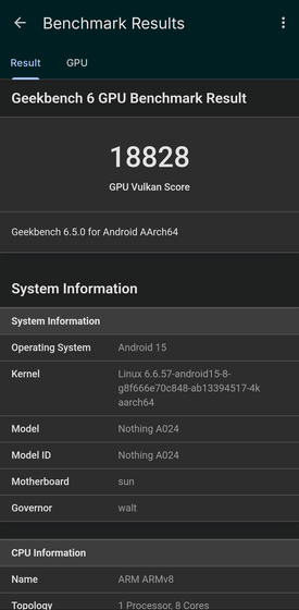 Vulkanでのパフォーマンススコアは1万8828でした。