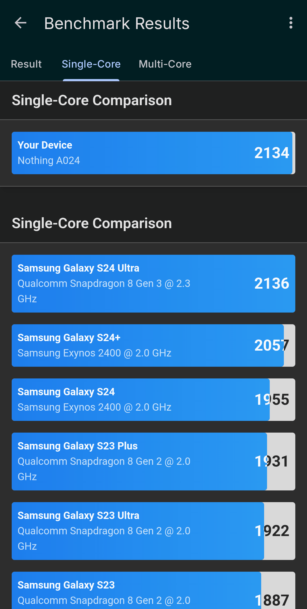 シングルコアのパフォーマンススコアは、だいたいQualcomm Snapdragon 8 Gen 3搭載のSamsung Galaxy S24 Ultraと同程度。