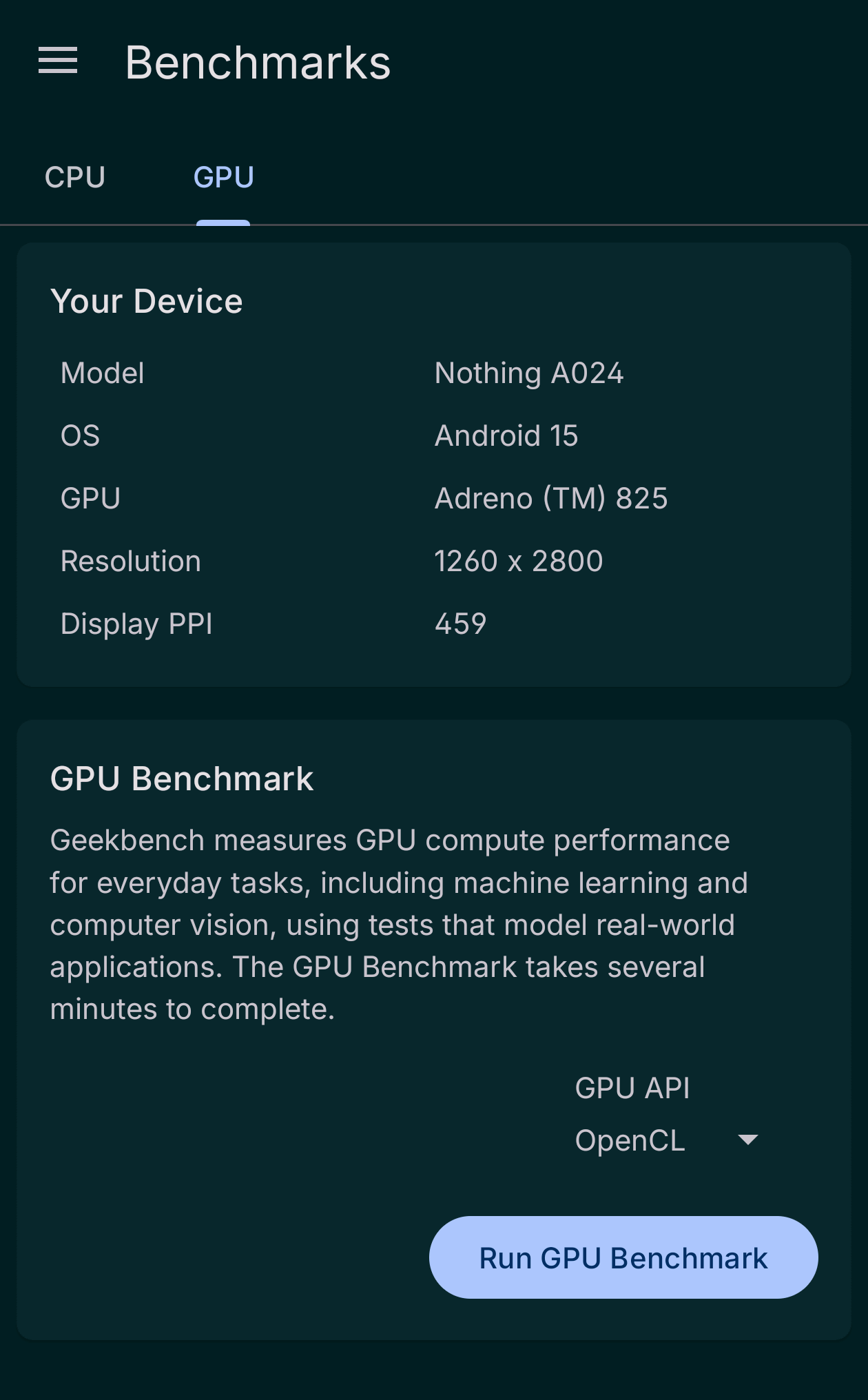 デバイスの型番は「A024」と表示されました。画面解像度は1260×2800ピクセル、画面密度は461dpi。今回借りたのはRAM12GB・ストレージ256GBのモデルで、RAMの総容量は「11234MB」、ストレージの総容量は「224.09GB」となっています。