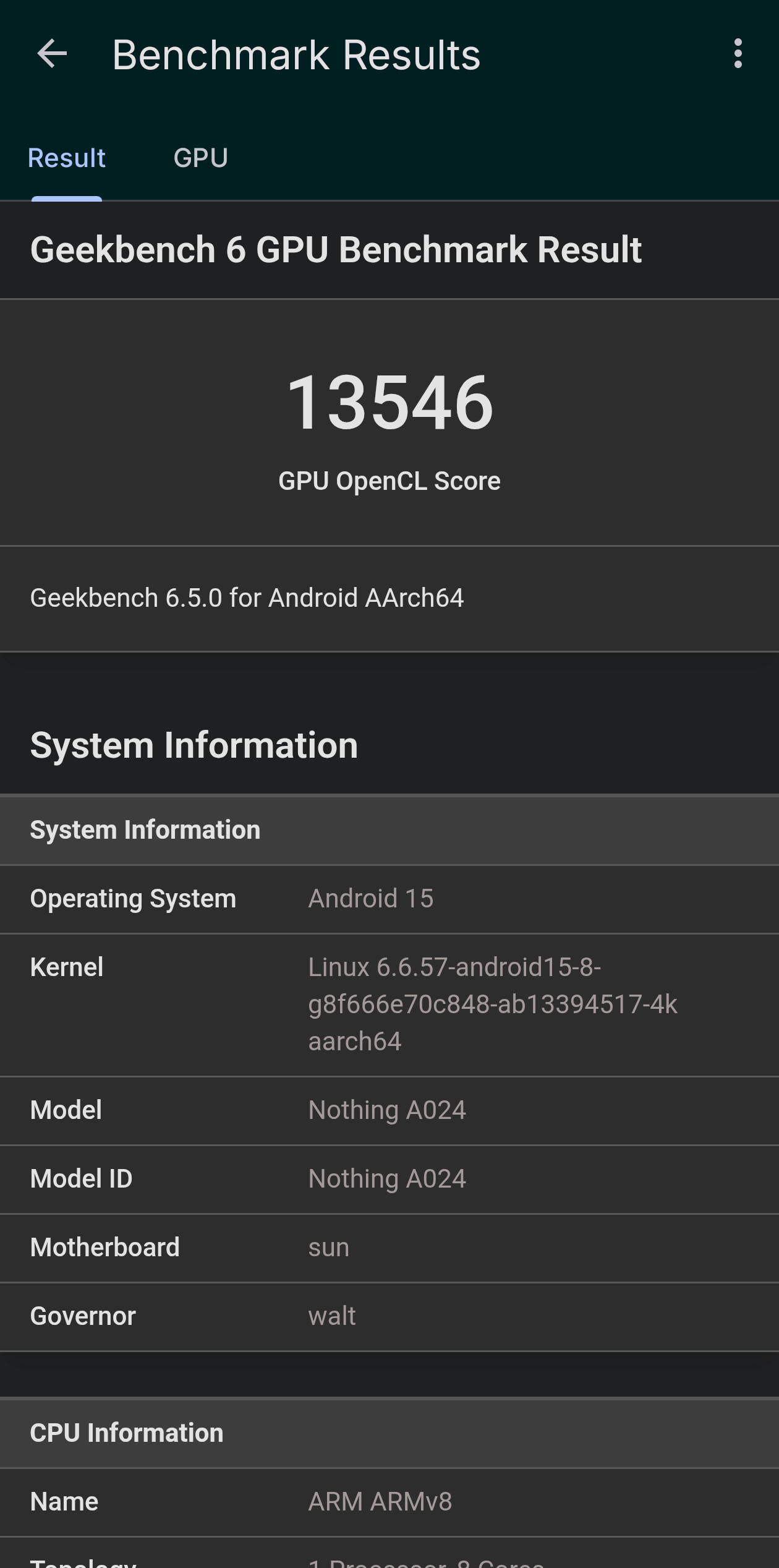 まずはCPU-Zでスペックの確認。搭載されているSoCはSnapdragon 8s Gen 4で、CPUは8コア。GPUはAderno(TM) 825を搭載しています。