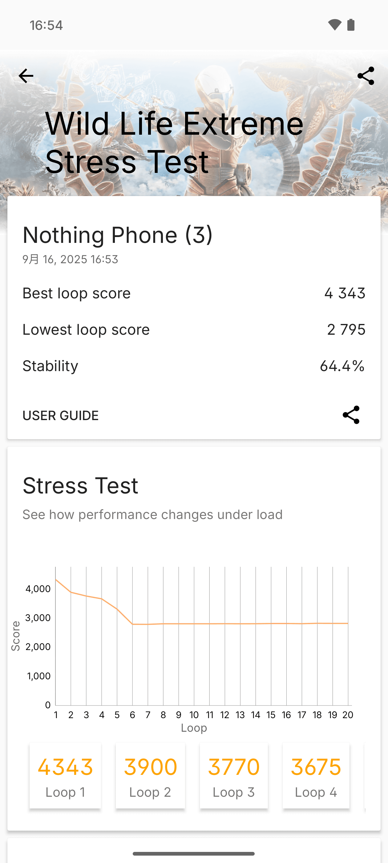 Wild Life Extreme Stress Testのスコア数値はこんな感じ。平均でだいたい3000前後をキープしている模様。