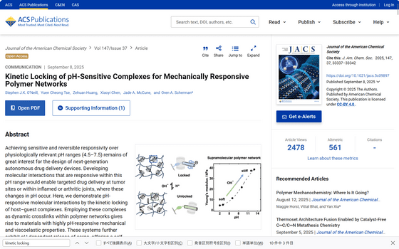 オニール氏らは、特定の分子を取り込む「ホスト」分子と、そのホスト分子に収まる「ゲスト」分子との相互作用を利用し、外的要因によってこの組み合わせがどの程度結合あるいは分離するのかを特定。これにより、体内のpHがある範囲に入ると長時間結合し、別のある範囲に入ると分離が進むといった材料を開発することに成功しました。