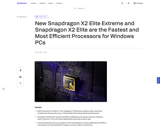 プレミアムPC向けSoC「Snapdragon X2 Elite/Elite Extreme」をQualcommが発表